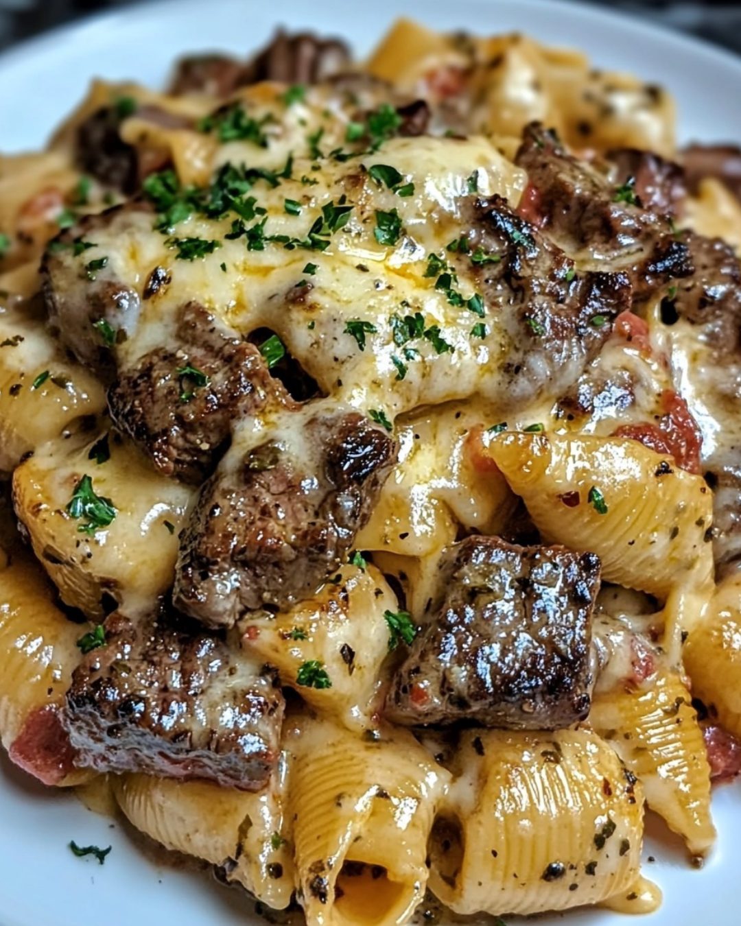 Combine & Serve: Toss pasta in the sauce, then add steak bites back in. Garnish with fresh parsley and enjoy!